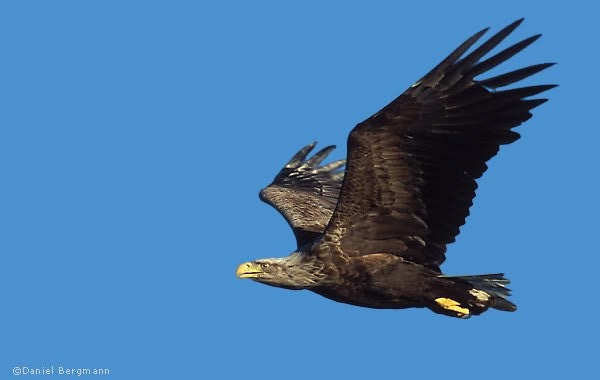 Cea mai mare păsăre ce se regaseste pe teritoriul Deltei Dunării. Coloristica corpului este maro, capul si coada fiind albe, penele de zbor negre. Se hrăneşte cu mamifere, peşti, broaşte, şerpi etc.